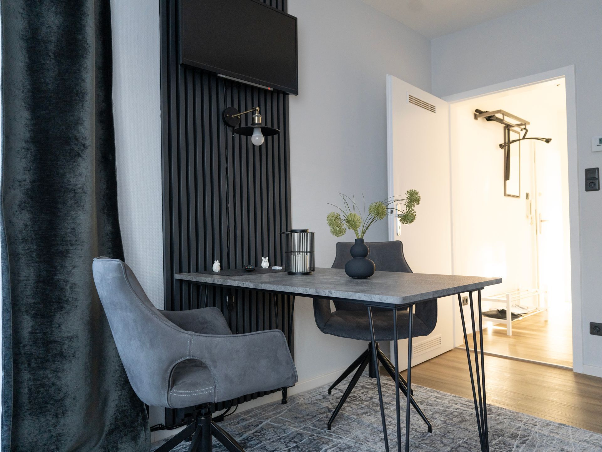 Der Tisch mit zwei gemütlichen Sesseln lädt zum Essen, Verweilen oder zum Arbeiten ein. Auf Wunsch gibt es einen Kinderstuhl.